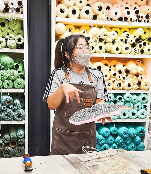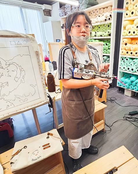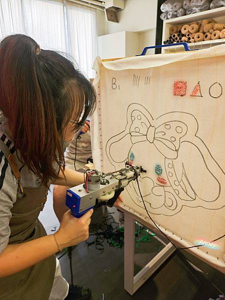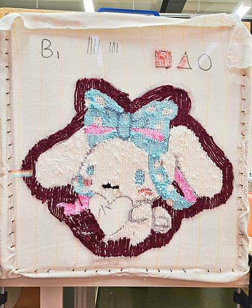 換上拖鞋入定位置後可以看見先前提供給小編的圖案已經由老師先畫好草稿在布上了